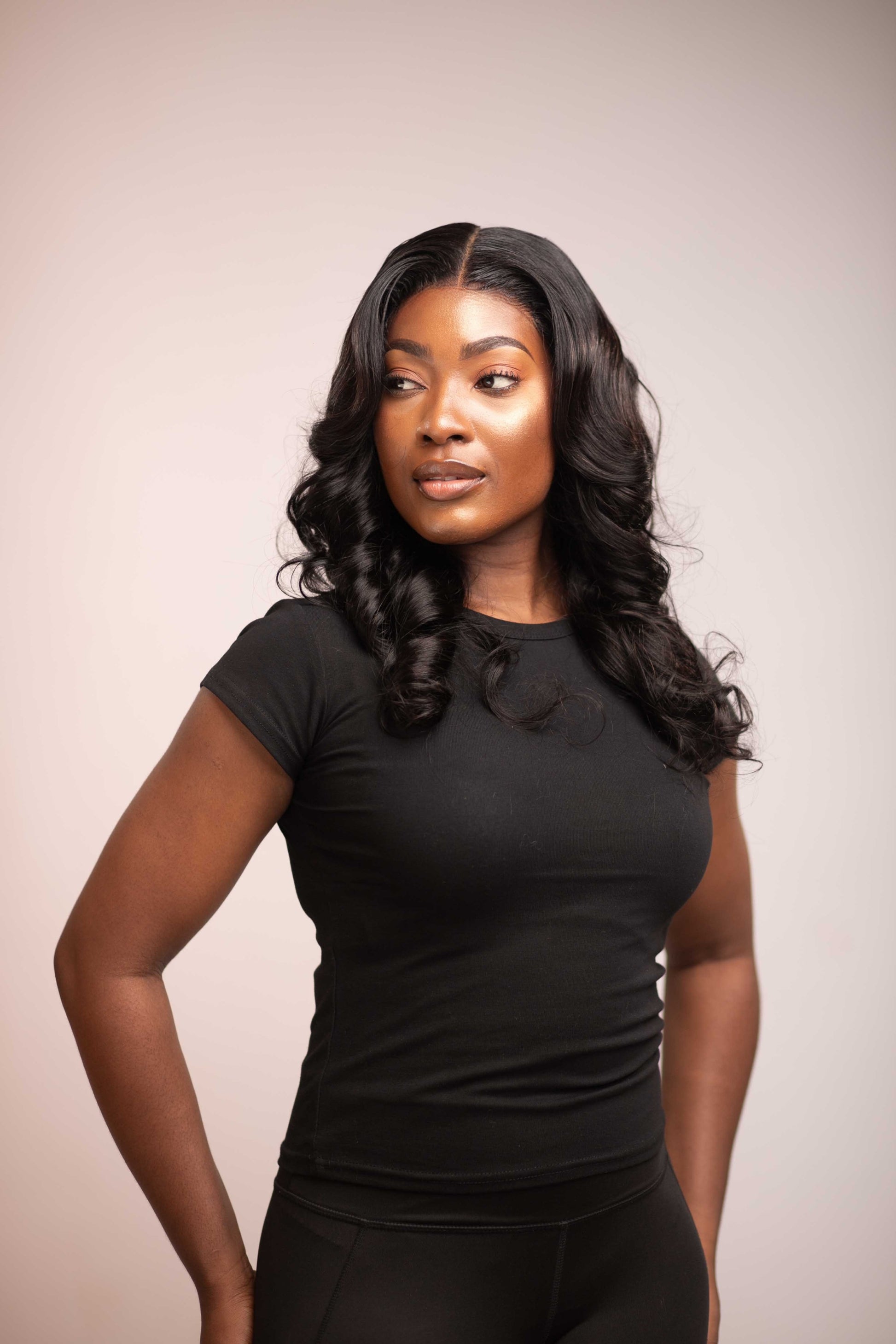 Apply heat-protectant, hair serum and curl with a curler (size of curling iron determine curl pattern).